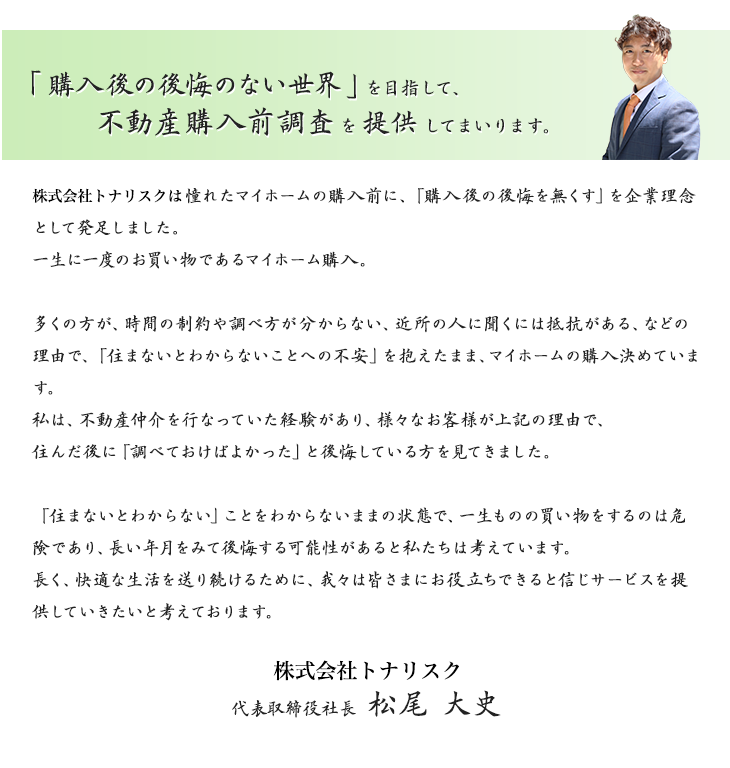 | 事業内容 | ・引越し前の隣人調査事業(トナリスク) ・近隣トラブルの仲裁サポート事業 |